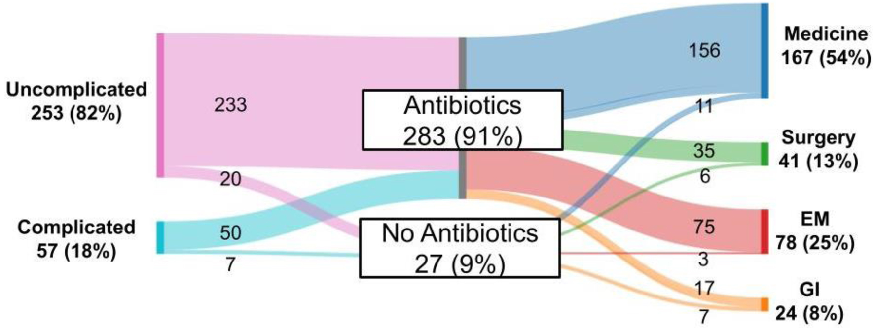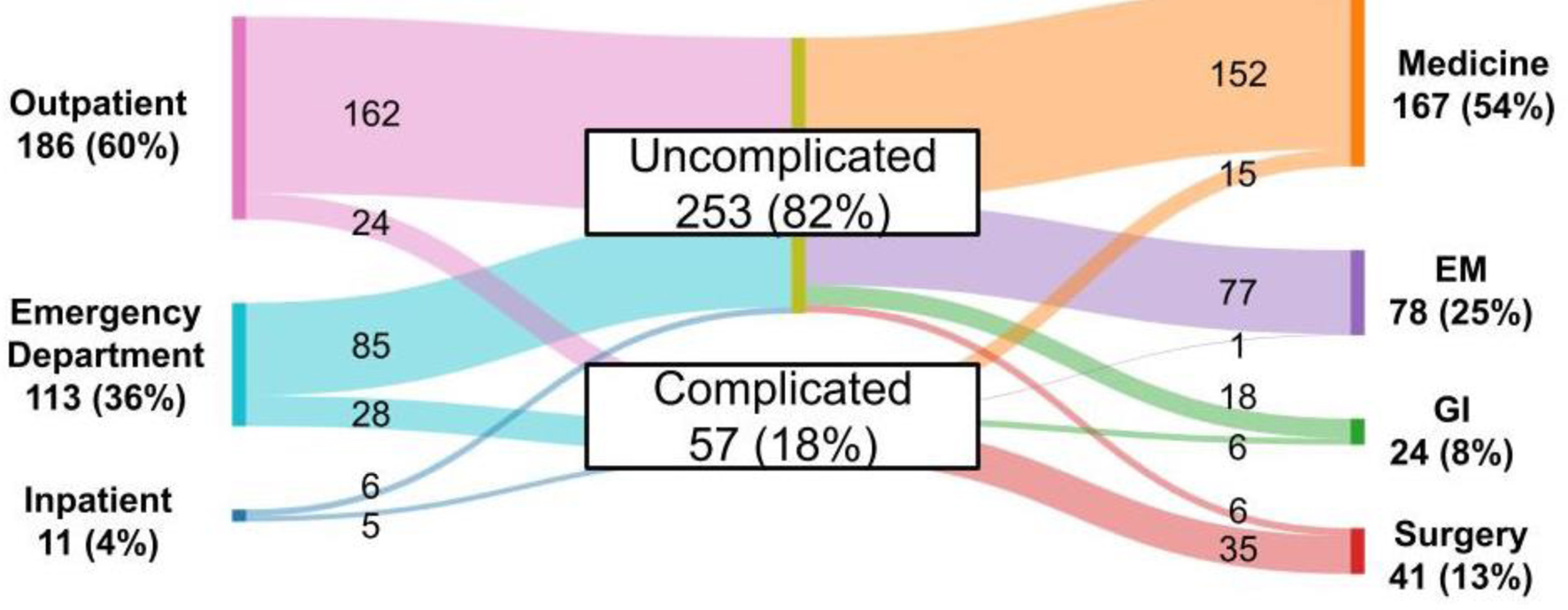 Subgroup analysis on treatment setting revealed differences in age, CCI, signs of sepsis at presentation, but not in sex or immunocompromised status (Table 1). Specifically, patients treated in the inpatient setting were older (mean age 67 vs. 61 in outpatient or 59 in ED, P < 0.01), and were more frequently septic (36.2% inpatient vs. 9.8% outpatient or 14.1% ED, P < 0.01) compared to those treated outpatient or at the ED. Patients with CCI 3 or higher were treated in the outpatient setting more frequently than inpatient (38% vs. 20%, P = 0.03), but not ED (38% vs. 29%, P = 0.17). The majority were managed by medicine (167 patients (53.9%)), while 78 (25.2%) were managed by EM, 41 (13.2%) by surgery, and 24 (7.7%) by gastroenterology, across various settings (Fig. 1).