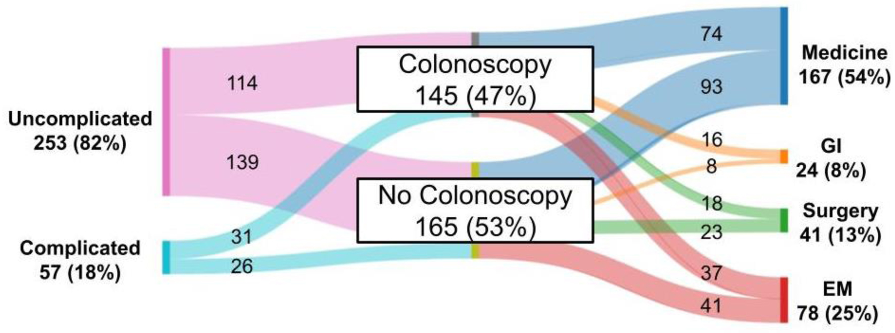 In the outpatient setting, managing specialties were categorized as medicine (including primary care, urgent care, and non-gastroenterology medical subspecialties), surgery, or gastroenterology. If the patient was evaluated in the ED and discharged, the managing specialty was classified as emergency medicine (EM). In the inpatient setting, managing specialties included medicine, surgery, and gastroenterology. If the patient was admitted to the hospitalist service without consulting services, the managing specialty was classified as medicine. However, if another specialty either admitted the patient or was consulted specifically for management of diverticulitis, then they were categorized according to the managing specialty.