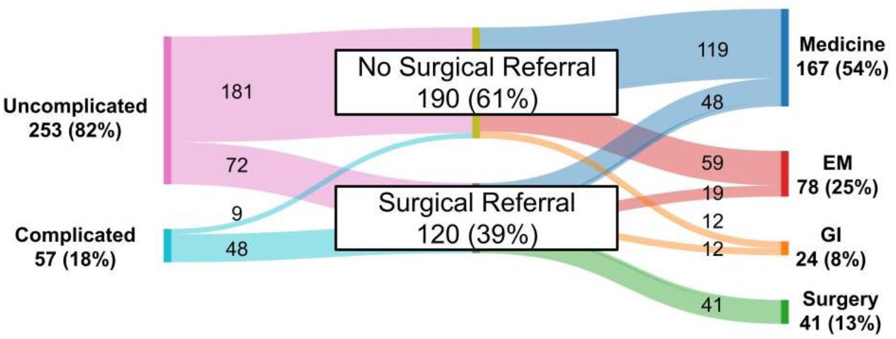 Up-to-date colonoscopy within 1 year of diagnosis was documented in 145 (46.8%) patients (Fig. 3), and there was no statistically significant difference between rates of up-to-date colonoscopy in uncomplicated versus complicated diverticulitis (45.1% vs. 54.4%, P = 0.137). In the outpatient setting, patients with diverticulitis managed by gastroenterology were most likely to be up to date on their colonoscopy (77.78% vs. 43.8% medicine or 71.4% surgery, P < 0.01), but not in other settings. Surgical consultation regarding management of diverticulitis was obtained in 120 (38.7%) patients (Fig. 4), with complicated diverticulitis patients more likely to be seen by a surgeon than patients with uncomplicated diverticulitis (84.2% vs. 28.5%, P < 0.001). All surgical referrals were from other providers (i.e., primary care providers, EM providers, or specialists). Of the 120 patients who met with a surgeon, 59 (49.2%) ultimately underwent surgery for diverticulitis, with surgery being more frequent in the complicated diverticulitis patients, 27 (47% of complicated), than the 32 (13% of uncomplicated) uncomplicated diverticulitis patients. Overall, three patients had emergent surgeries (two patients with peritonitis due to perforation, one patient with large bowel obstruction).