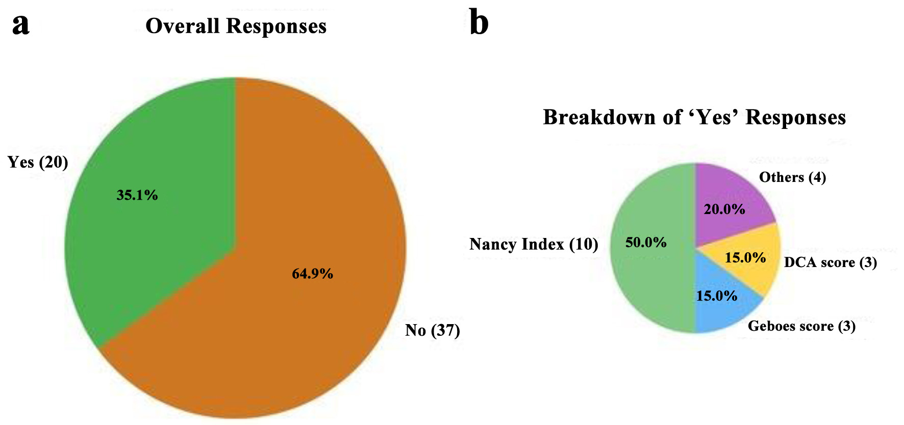 Methods: This study surveyed a group of pathologists who have completed postdoctoral medical training with demonstrated interest and involvement in the field of gastrointestinal pathology to evaluate their knowledge, practices, and perspectives on histologic assessment using standardized scoring systems in clinical practice in UC patients. The survey was hosted on an online platform, and responses were recorded anonymously.
