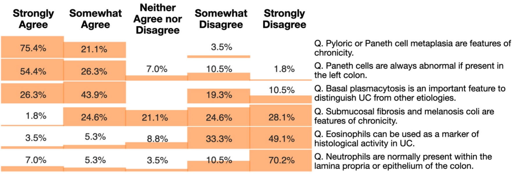 ![]() Click for large image | Figure 3. Heatmap showing pathologists’ responses to knowledge assessment questions on histologic features of inflammatory bowel disease. Participants rated their level of agreement with each statement using a five-point Likert scale: strongly agree, somewhat agree, neither agree nor disagree, somewhat disagree, and strongly disagree. The heatmap shows the percentage of respondents selecting each category for statements related to features of chronicity, diagnostic markers, and normal histologic findings in the colon in inflammatory bowel disease. |