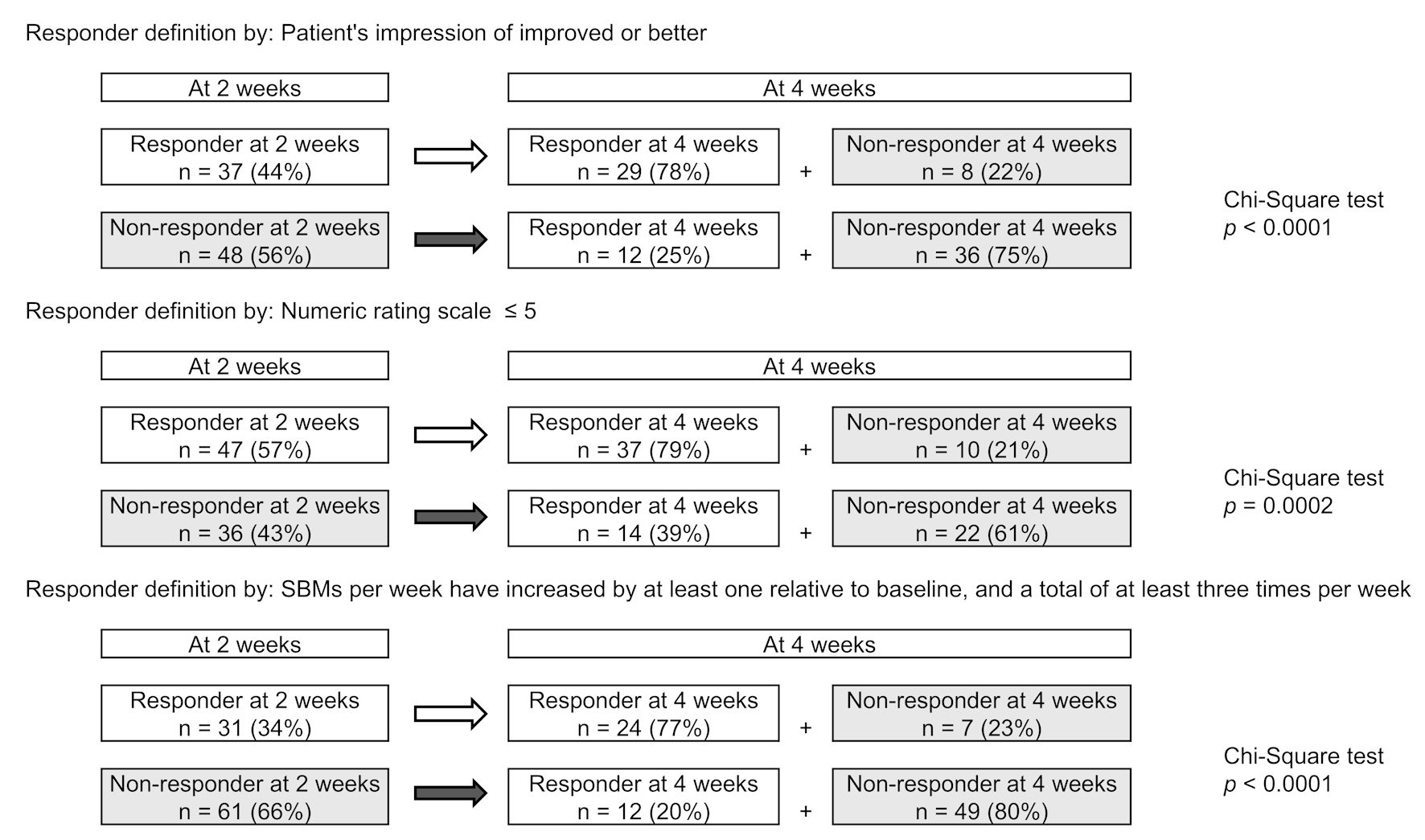Conclusions: The therapeutic response at 2 weeks is the most significant predictor of subsequent treatment response at 4 weeks in patients with chronic constipation.