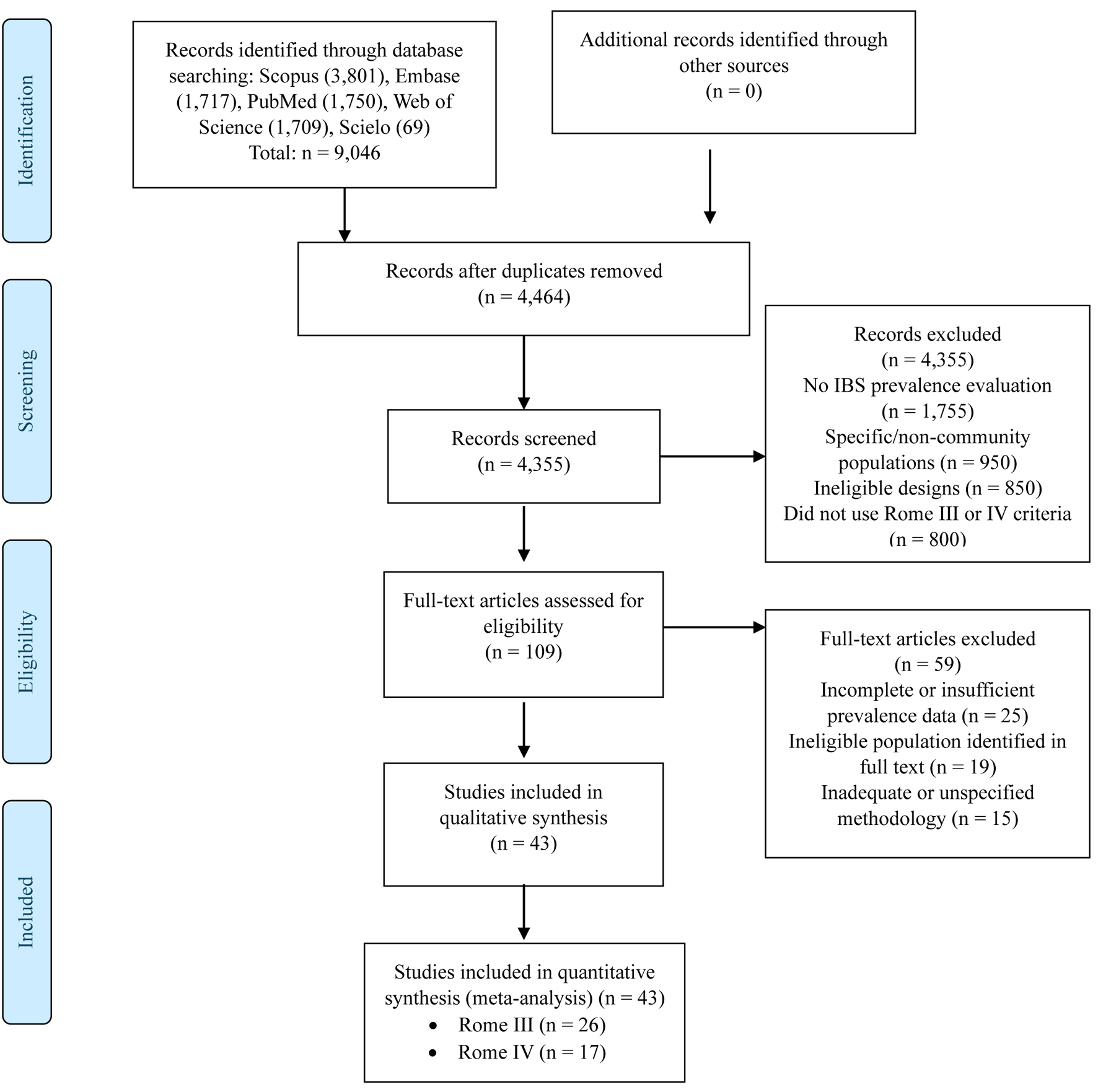 The study selection process was conducted following PRISMA guidelines. The initial search in electronic databases identified 9,046 records, distributed as follows: Scopus (3,801), Embase (1,717), PubMed (1,750), Web of Science (1,709), and Scielo (69). After removing duplicates, 4,464 unique records remained for review. During the screening phase, 4,355 studies were excluded, leaving 109 articles for full-text evaluation. Of these, 59 additional articles were excluded. Finally, 43 studies were selected for qualitative and quantitative synthesis, of which 26 employed Rome III criteria and 17 used Rome IV criteria [10-52] (Fig. 1).