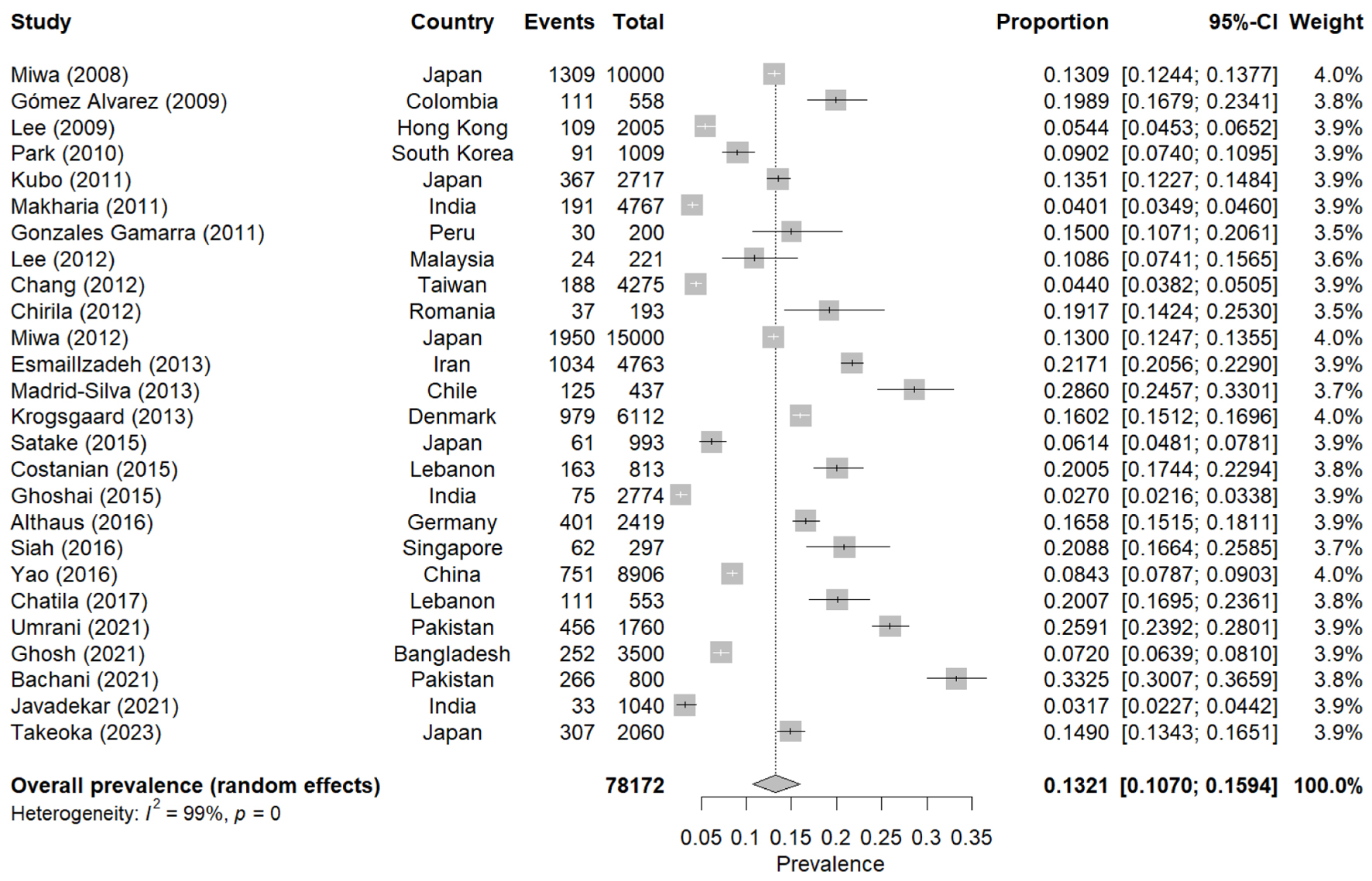 This meta-analysis included 26 studies contributing a total of 78,172 participants [10-29, 33, 36-39, 47] (Fig. 2). The estimated global prevalence of IBS, based on Rome III criteria, was 13.21% (95% CI: 10.70-15.94%). The analysis revealed a high degree of heterogeneity (I2 = 99%, P < 0.001).