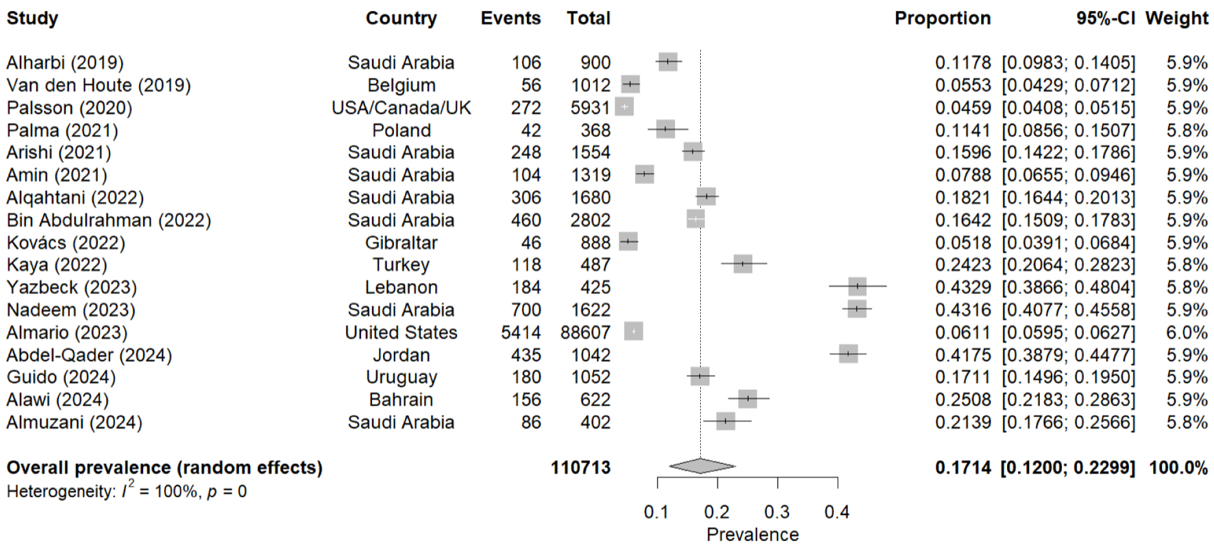 Individual prevalences fluctuated from values close to 5.5% [31] to estimates exceeding 43.0% [46]. Sample size also showed considerable differences, notably in a study with 88,607 participants [48], which provided the greatest statistical weight in this meta-analysis. Other studies with fewer subjects (e.g., n = 368) [34] contributed more specific estimates but maintained the trend of high methodological and population variability.