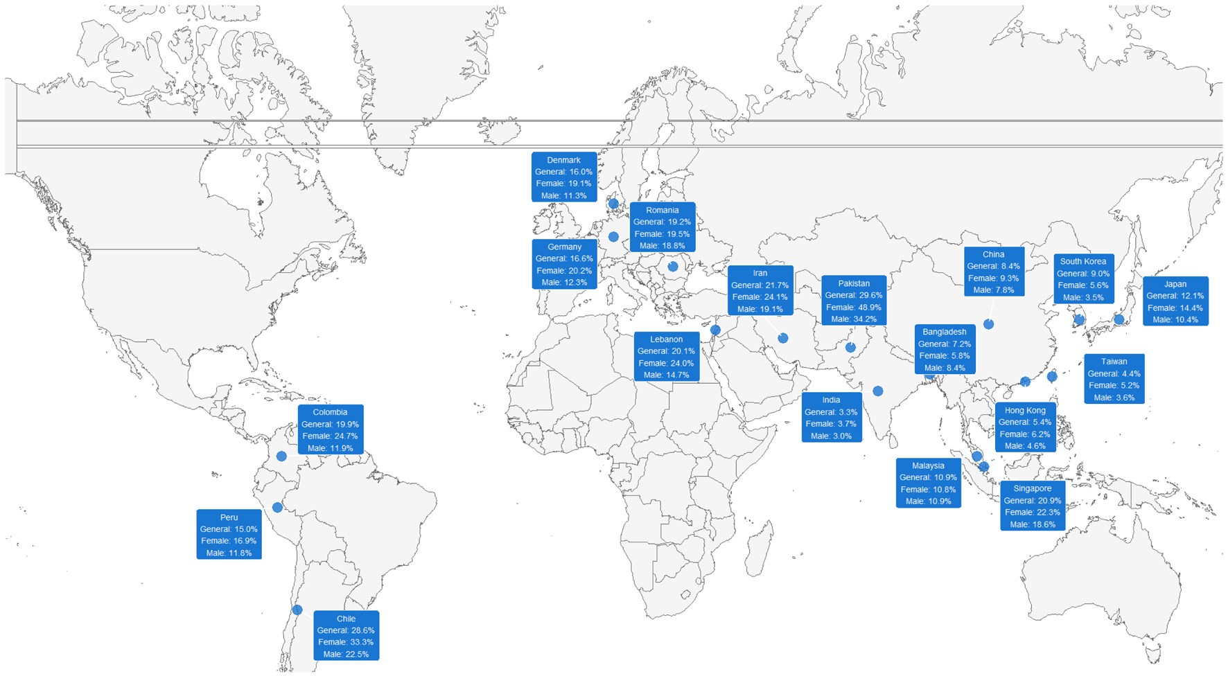Additionally, Figures 4 and 5 show the prevalence distribution by country, both generally and by sex.