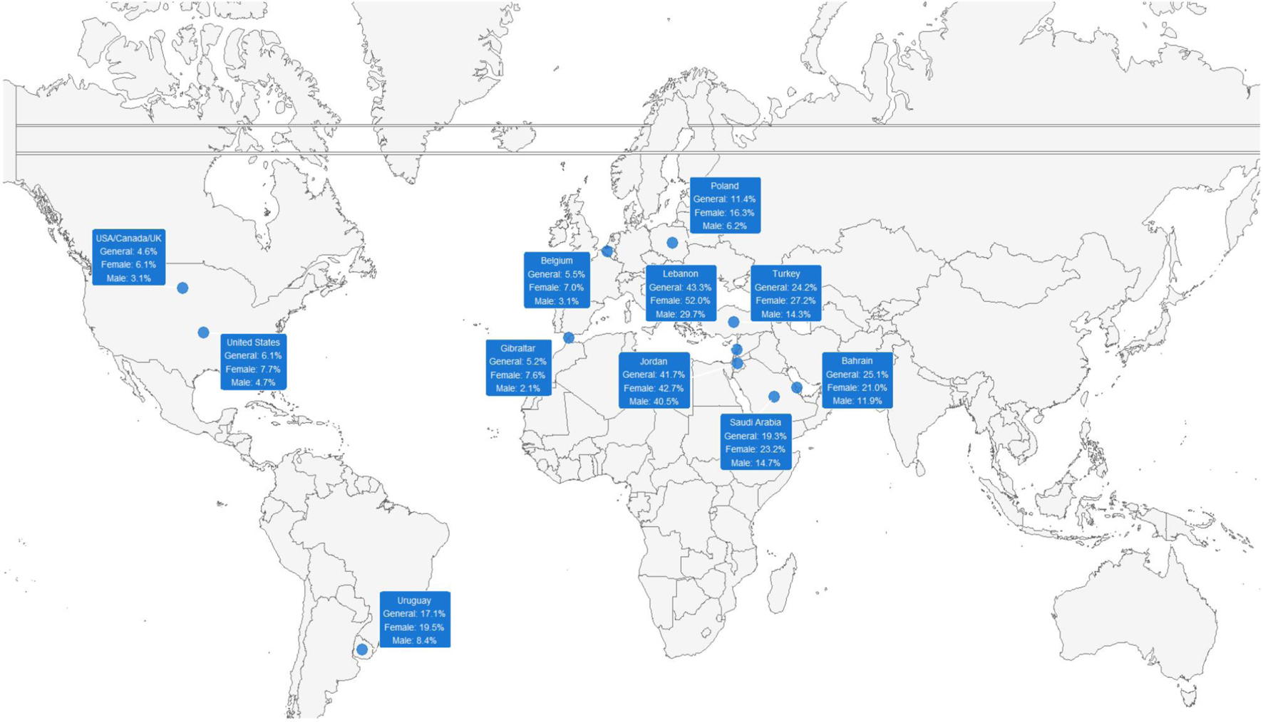 ![]() Click for large image | Figure 5. Global distribution of IBS prevalence according to Rome IV criteria, stratified by sex. IBS: irritable bowel syndrome. |