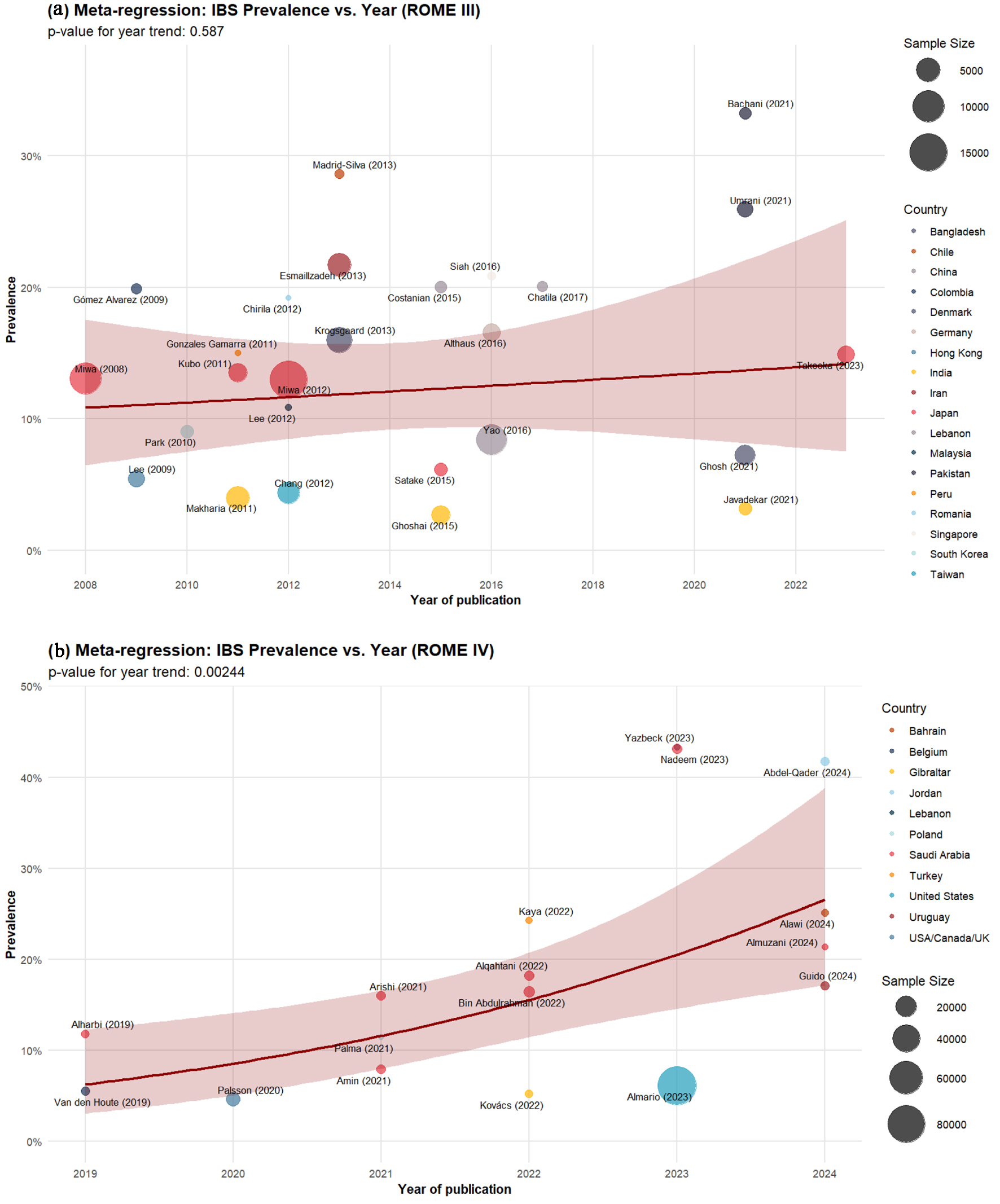 Figure 6 shows the meta-regression analysis for both Rome III (Fig. 6a) and IV (Fig. 6b) by year of publication. For Rome III, based on 26 studies evaluated during the period 2008 - 2023, no statistically significant temporal trend was observed (P = 0.587), showing a relatively flat regression line over time. Prevalence remains stable around 10-15%, with some outliers such as Madrid-Silva (2013) reporting prevalences close to 30%. The width of the confidence band reflects substantial heterogeneity among studies, indicating that factors other than publication year have greater influence on the observed differences. The size of each bubble corresponds to the sample size, where studies with larger samples (e.g., [10, 20]) have greater statistical weight in the model.