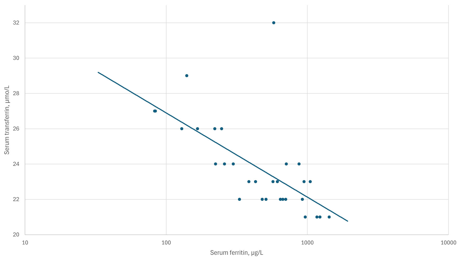 Healthy men with ferritin values above 300 µg/L, like men with “normal” iron status, showed no correlations between iron and ferritin vs. transferrin, suggesting that the high ferritin values may be physiological and not of pathological significance. Notably, transferrin levels were slightly but significantly lower in these men, suggesting a downregulation of transferrin synthesis in men with ample body iron reserves. However, our series was too small to draw firm conclusions.