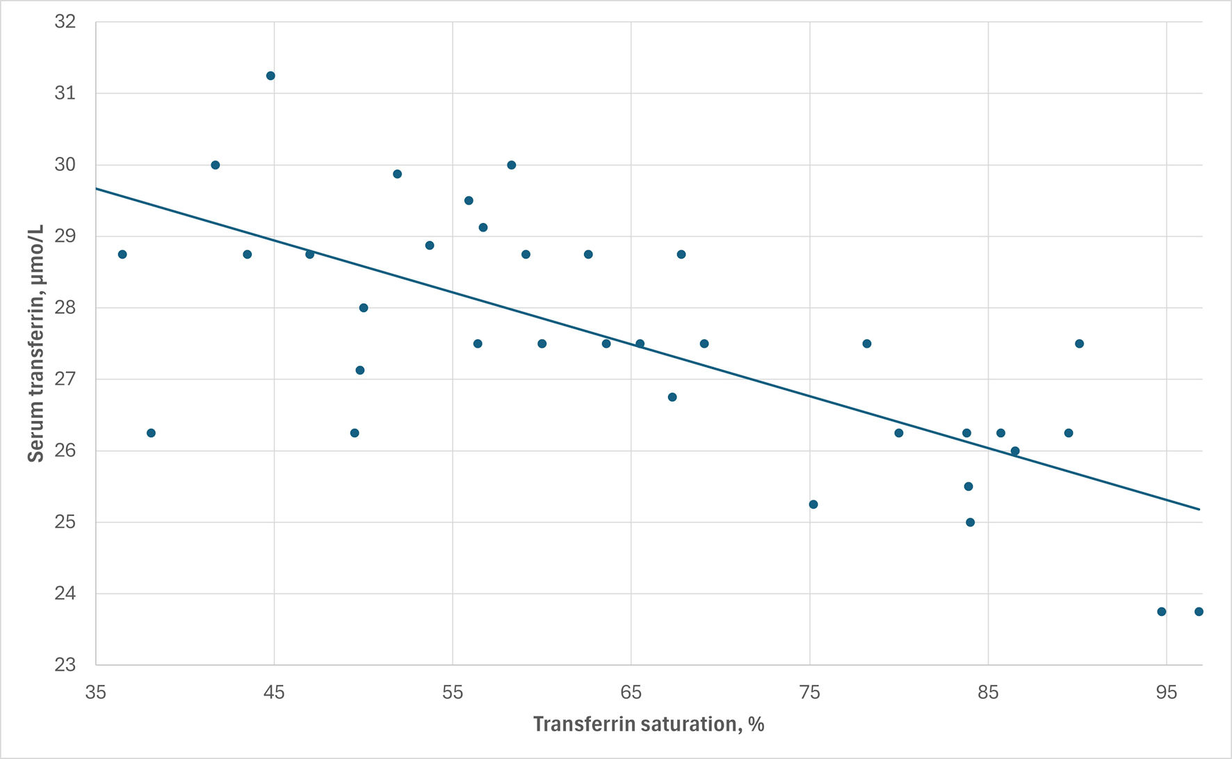 Healthy subjects with low ferritin (< 30 µg/L) have higher transferrin, and those with high ferritin (> 300 µg/L) have lower transferrin than subjects with “normal” iron status, suggesting a direct effect of iron on transferrin synthesis. This is supported by studies in HepG2-HFE-wt/wt cells [17].