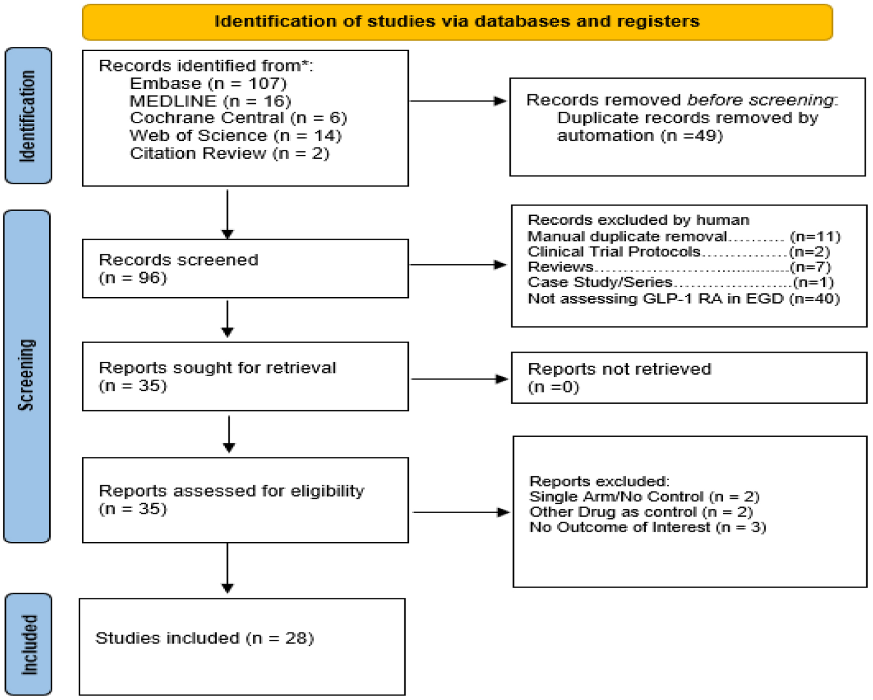 A comprehensive search strategy to identify studies reporting the effects of GLP-1 agonists on stomach emptying or mucosal visibility in EGD procedures was constructed in Embase (Embase.com, Elsevier) by an experienced health sciences librarian (WL-S) using truncated keywords, phrases, and subject headings. This strategy was translated to MEDLINE (PubMed platform, National Center for Biotechnology Information, National Library of Medicine), Cochrane Central Register of Controlled Trials (CochraneLibrary.com, Wiley), and the Web of Science Core Collection (Web of Science platform, Clarivate) with all searches performed on June 25, 2024 (Supplementary Material 1, gr.elmerpub.com). No publication date or language limits were used. All results were exported to EndNote 21 citation management software (Clarivate, Philadelphia, PA, USA) and duplicates were removed by successive iterations of EndNote’s duplicate detection algorithms and manual inspection. We adhered to Preferred Reporting Items for Systematic Reviews and Meta-Analyses (PRISMA) guidelines [20] (Supplementary Material 2, gr.elmerpub.com). No language restrictions were applied.