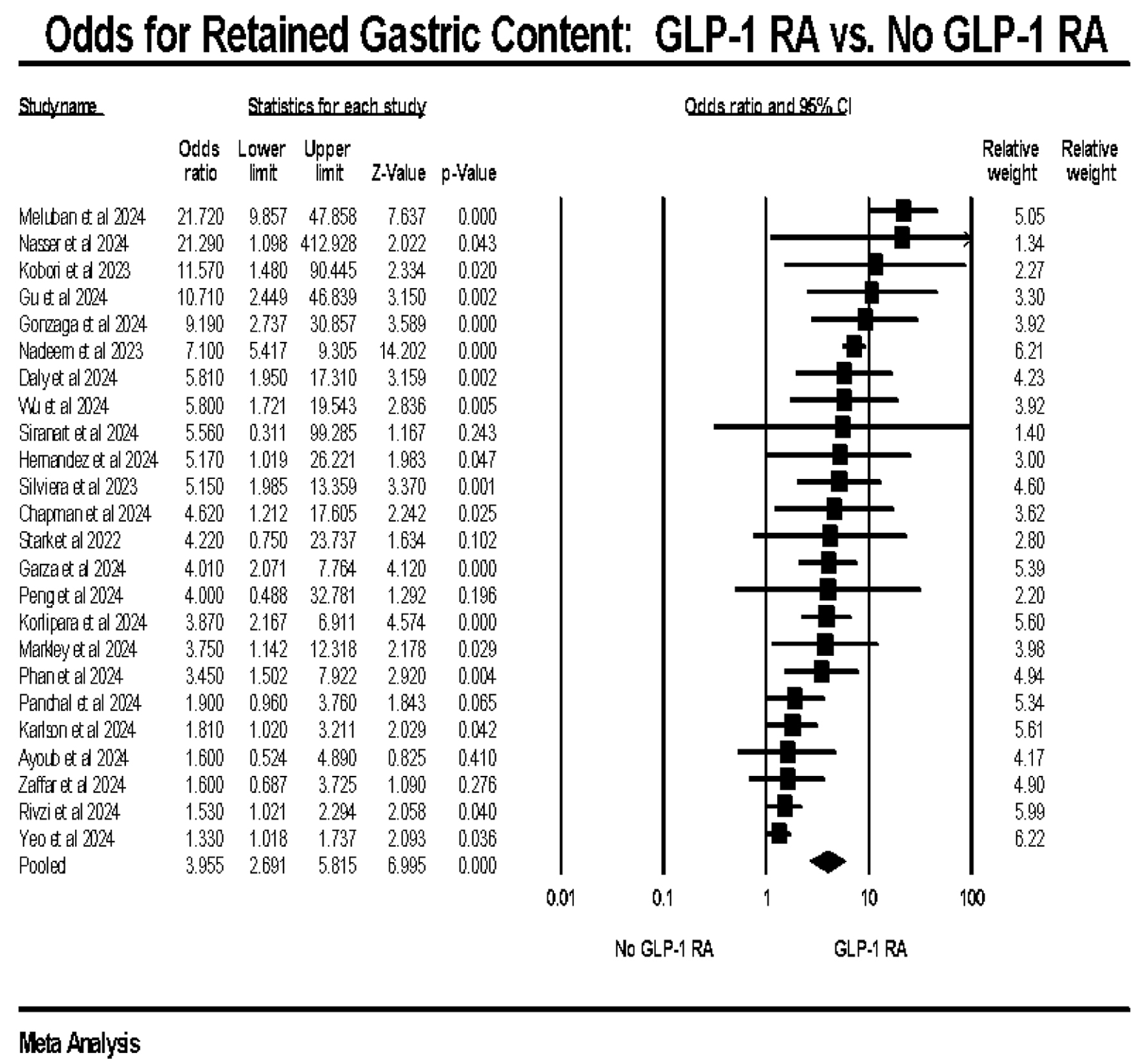 Given the rising prevalence of GLP-1 RA use and the critical importance of patient safety during upper endoscopic procedures, a systematic review and meta-analysis was needed to rigorously evaluate the potential impact of GLP-1 RAs on endoscopic outcomes. Our study aims to provide a clearer understanding of the risks associated with GLP-1 RA use in the context of upper endoscopy, addressing previous uncertainties and informing clinical decision-making. By synthesizing data from multiple studies, our analysis seeks to guide healthcare providers in balancing the benefits of GLP-1 RAs with potential procedural risks.