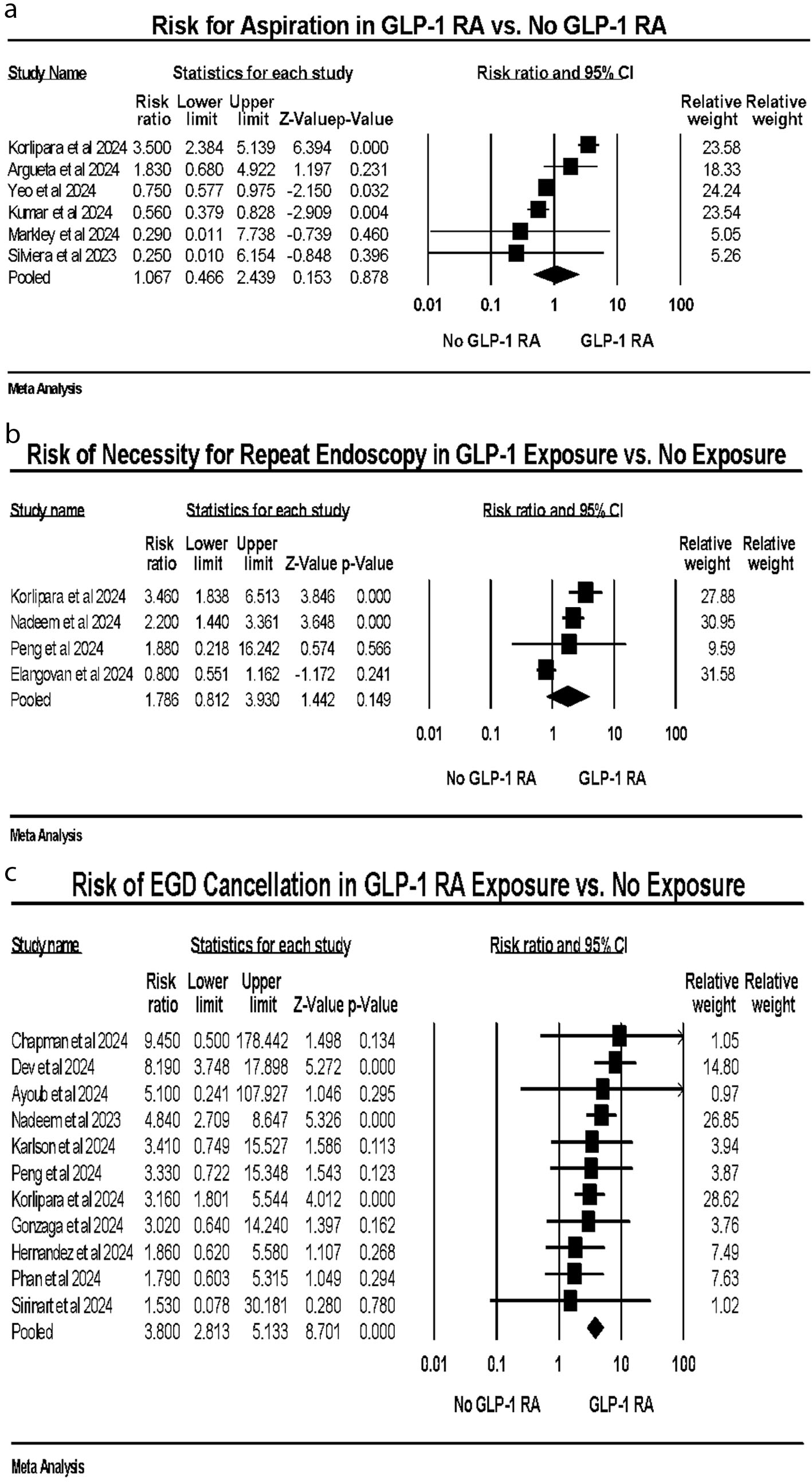 GLP-1 RA exposure was not associated with aspiration (OR: 1.06, CI: 0.466–2.439, P = 0.145, I2: 91.44%) (Fig. 3a) or increased risk of the need for repeat upper endoscopy (OR: 1.78, CI: 0.812–3.930, P = 0.145, I2: 85.32%) (Fig. 3b). GLP-1 RA use was associated with higher number of EGD cancellations (OR: 3.80, CI: 2.813–5.133, P < 0.0001, I2: 4.19%) (Fig. 3c). Aspiration events were rare across studies, generally occurring in less than 1% of procedures in both groups.