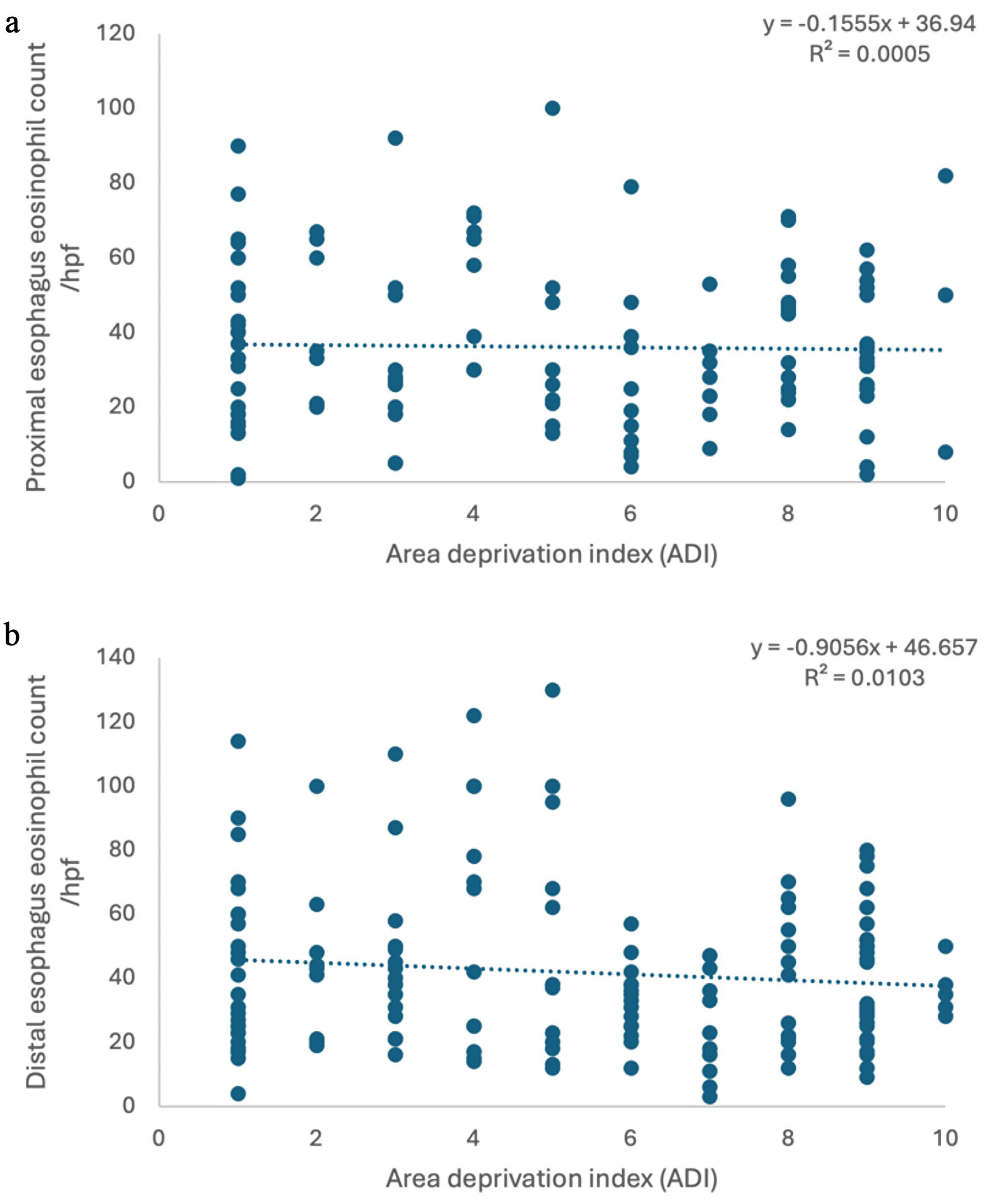 ![]() Click for large image | Figure 1. No correlation was found between ADI and eosinophil count in proximal esophagus (a) and distal esophagus (b). ADI: Area Deprivation Index. |