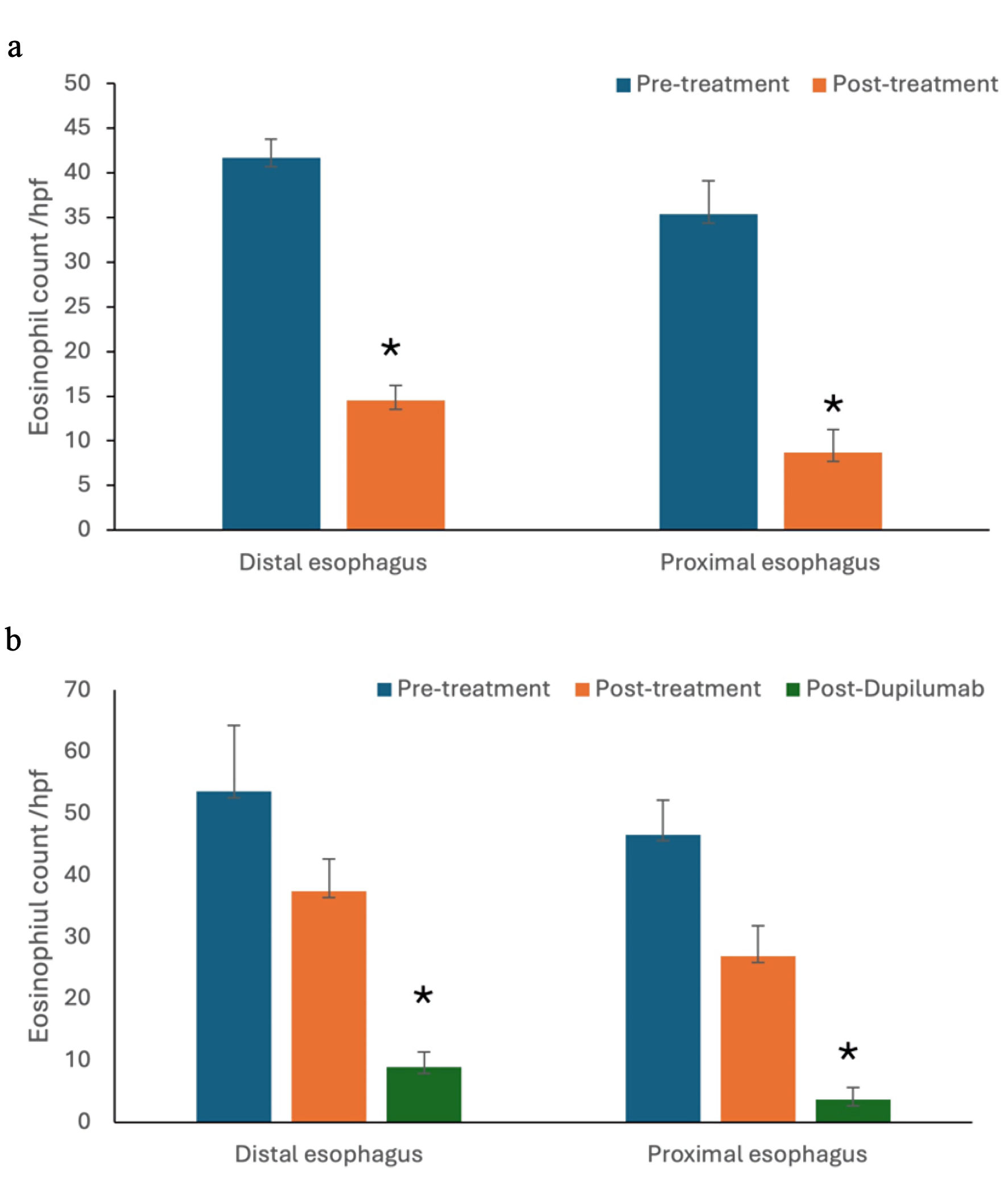 One hundred twenty-nine of the total 145 patients, described in Table 2, demonstrated significant histological response to non-dupilumab therapies including dietary elimination, PPI, and/or STC, with reduction of both proximal and distal esophageal eosinophil count (P value < 0.05) (Fig. 2a). No significant clinical and histological response was observed in other 16 patients. These 16 patients, described in Table 3, of the total of 145 patients, were subsequently treated with dupilumab. Follow-up endoscopy was performed on these patients 6 months after initiation of dupilumab and demonstrated significant histological improvement (distal esophagus eosinophil count/HPF: 37.4 ± 5.26 versus 8.92 ± 2.49; proximal esophagus eosinophil count/HPF: 26.9 ± 4.95 versus 3.67 ± 2.01; P value < 0.05) (Fig. 2b)