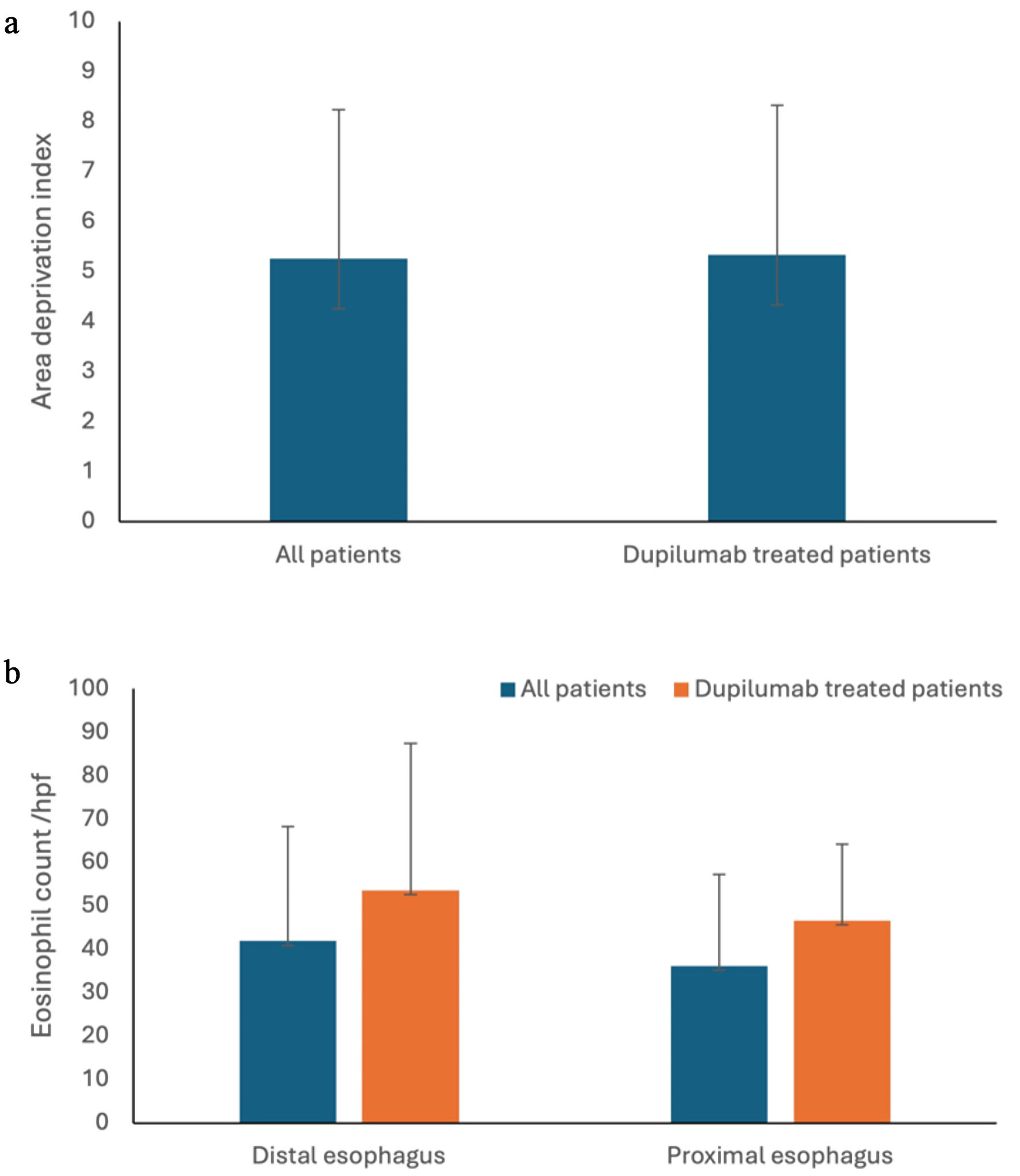 Results: A total of 145 pediatric patients were included in the study. The patient population was spread relatively evenly across the different levels of the ADI. Our analysis showed no significant correlation between ADI and eosinophil count in the distal and proximal esophagus. One hundred twenty-nine patients demonstrated significant histological response to conventional non-dupilumab therapies. In a subset of 16 patients receiving dupilumab, the analysis revealed no significant difference of ADI, and baseline eosinophil count at the diagnosis in the proximal and distal eosinophil count compared with the overall cohort. However, dupilumab treatment was associated with a significant reduction in eosinophil counts, suggesting improved histologic outcomes compared with non-dupilumab therapies.